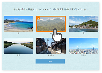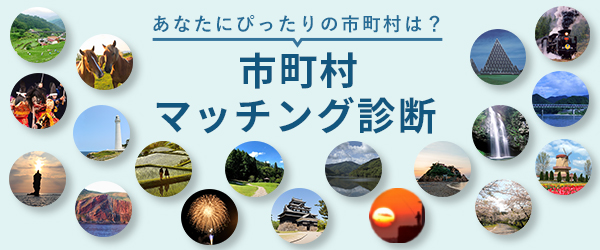 市町村マッチング診断とは、表示される写真を見ながら「よりあなたの思い描く暮らしに近いイメージ」を選択していくと、あなたの理想に当てはまる可能性の高い3つの市町村をご提案します。ぜひ移住先選びのヒントにしてください。